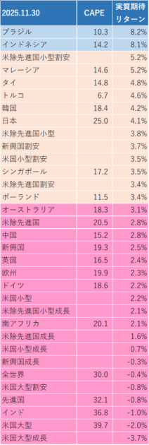 株価の有力な割安・割高評価である「CAPE」世界各国株式版が今月も更新されましたよ! のお話です。